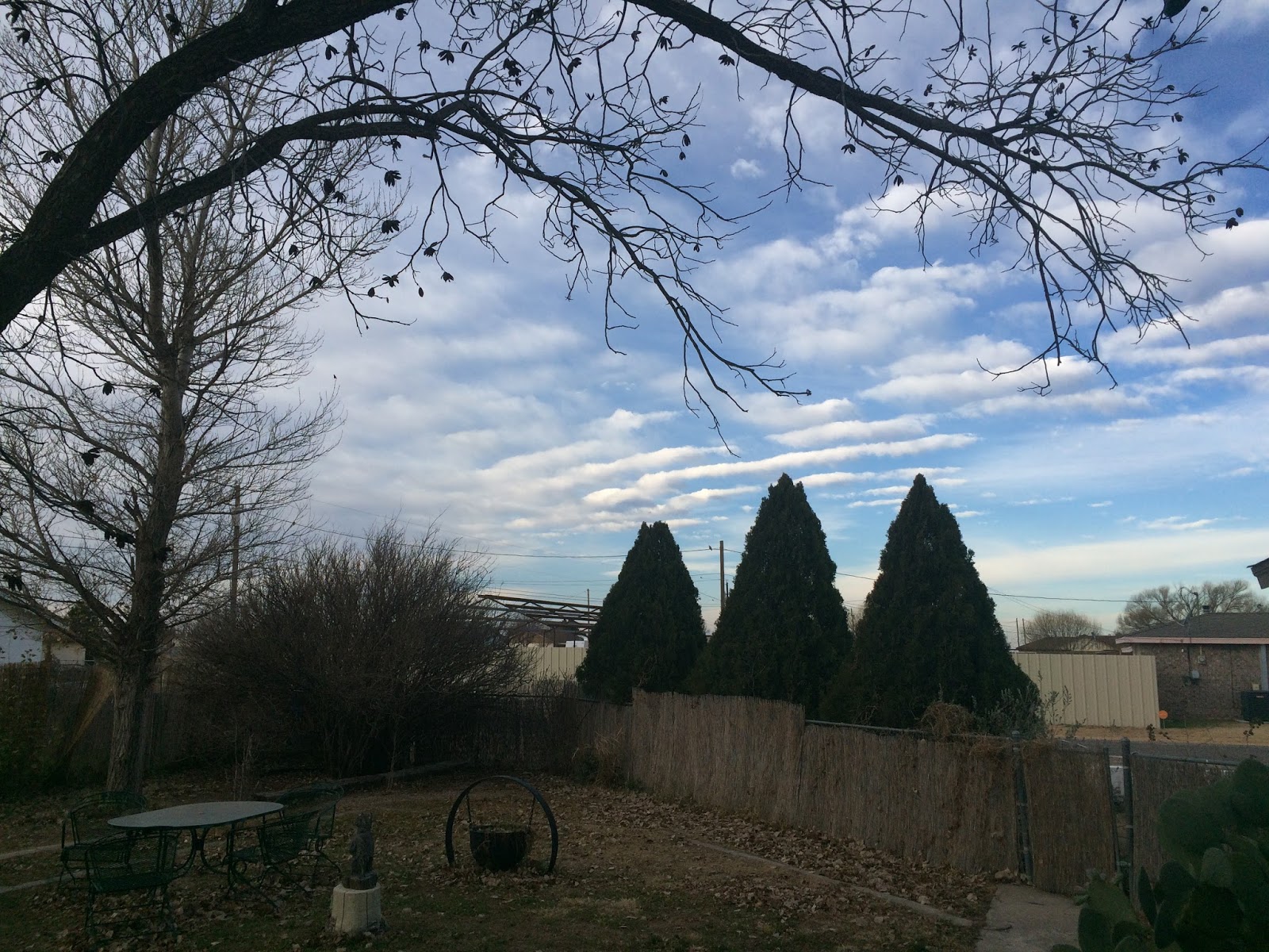 The three green sentinels in mid picture I planted years ago. When first joined to the soil they stood not over a foot high. Now they top me, and other evergreens I planted various other places did not fair as well. There is still a lot left up to chance in nature. The pecan tree framing the picture is a native plant while the cottonwood behind it that seems to have struggled and still strains to make its mark on the sky I planted to remind me of the bosque I used to frequent growing up in Socorro county.