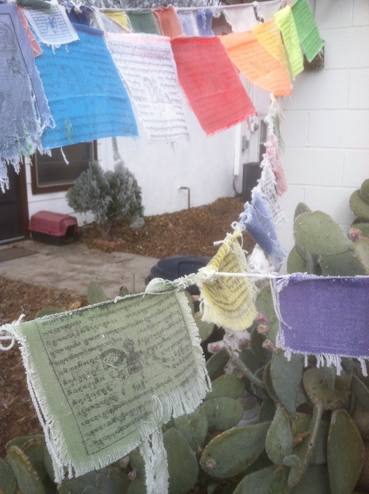 Tibetans string prayer flags to flap and fly in the wind believing that their prayers will thus be issued into the sky. These prayer flags in my backyard are seen frozen stiff on a cold winter day past, holding their remaining captive prayers until a warm breeze can help them supplicate their hanger’s needs to earth’s considerations.
